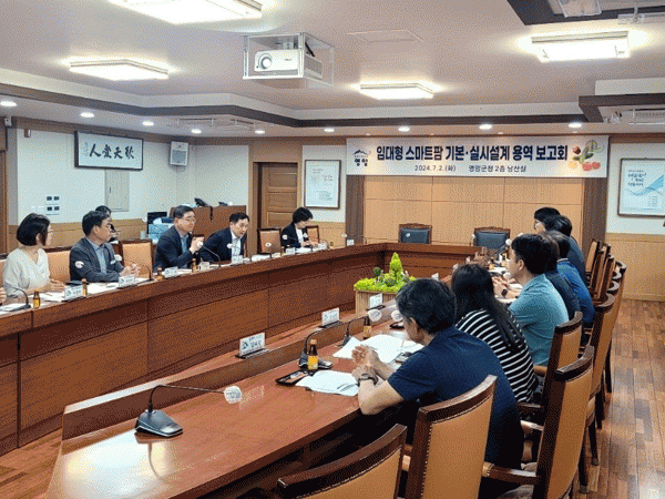 영암군이 2일 군청에서 청년농업인, 한국농어촌공사 직원 등이 참석한 가운데 ‘지역특화 임대형 스마트팜 조성사업 기본계획 수립용역 중간 보고회’를 열었다.