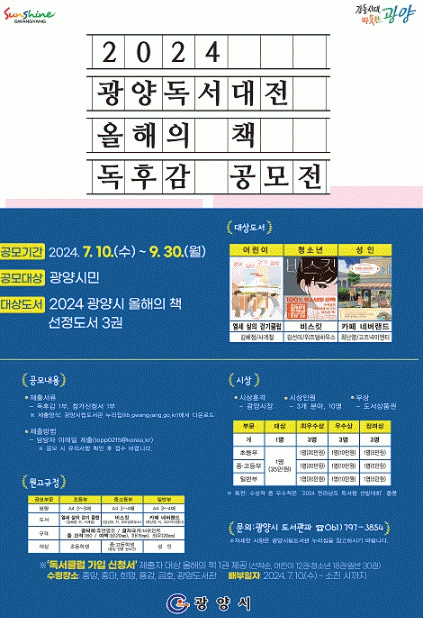 참여를 희망하는 시민은 광양시립도서관 누리집에서 양식을 내려받아 관련 서류(참가신청서 1부, 독후감 1부)를 담당자 이메일로 제출하면 된다.