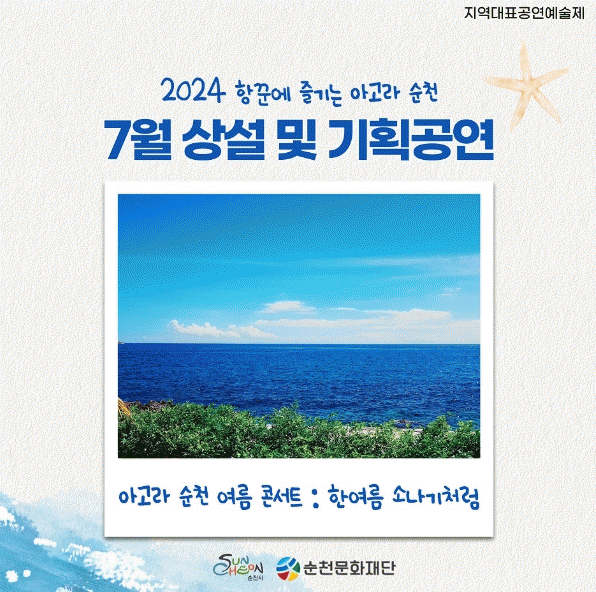 ‘2024 아고라 순천’은 7월 한달 '아고라 순천 여름 콘서트 : 한여름 소나기처럼'을 주제로 시민들과 순천을 찾는 관광객을 대상으로 순천시 곳곳에서 한여름 무더운 열기를 식혀줄 공연을 진행할 예정이다.