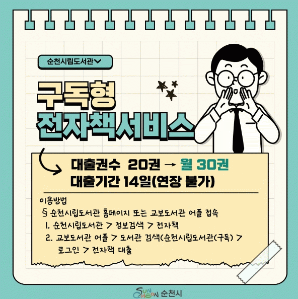 전자책 서비스는 순천시립도서관 대출증 발급 회원이면 누구나 이용이 가능하며, 순천시립도서관 누리집과 모바일 어플(교보도서관)에서 전자책을 볼 수 있다. 1인당 월 30권까지 대출 가능하며, 대출기한은 14일이다.
