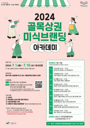 아카데미는 7월부터 9월까지 9주 과정으로 매주 1회 3시간씩 광산구 지역경제활력센터 2층(소촌로85번길 14-9)에서 진행한다.