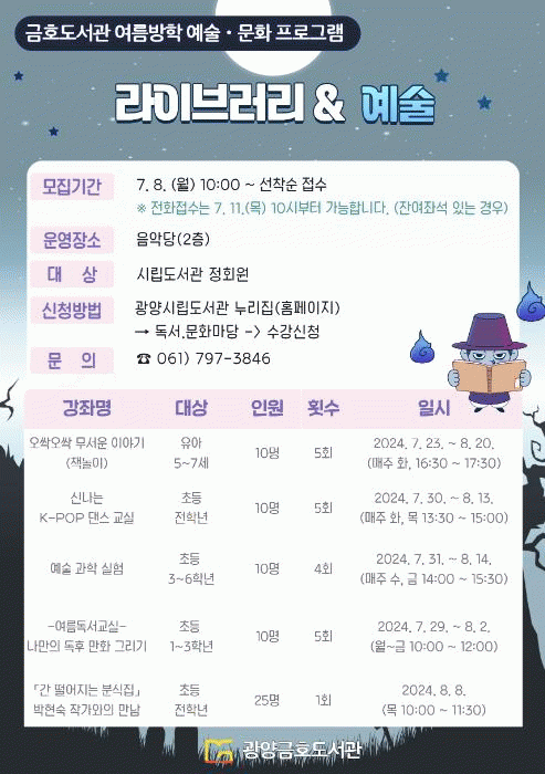 개설 과정은 총 5개로 ▲오싹오싹 무서운 이야기(유아 5부터 7세 대상) ▲나만의 독후 만화 그리기(초등1부터 3학년 대상) ▲예술 과학실험(초등3학년부터 6학년) ▲신나는 K-POP 댄스 교실(전체 초등학생 대상)이 있으며, 여름방학 특별 강연으로 ▲'간 떨어지는 분식집' 박현숙 작가와의 만남도 개설될 예정이다.
