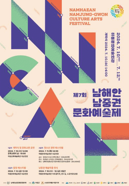 7월 10일 14시 하동군 문화예술회관에서 열리는 문화예술제 기념식에는 남해안남중권 9개 시군 단체장과 지역 예술인들이 참석하여 예술로 하나되는 남해안남중권의 비전을 제시하고, 문화예술제의 시작을 알리고 성공개최를 기원하는 하동군립예술단 공연이 준비되어 있다.