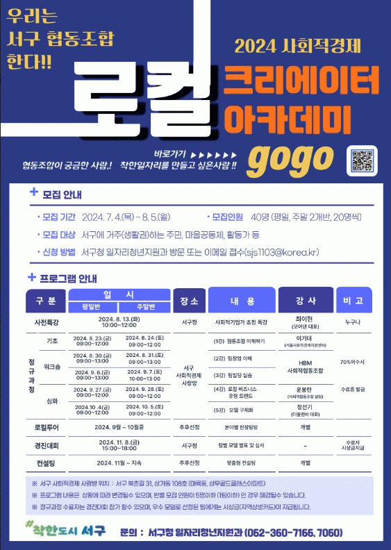 정명숙 일자리청년지원과장은 “사회적경제 로컬크리에이터 아카데미를 통해 주민들의 다양한 공동체 활동이 지역의 따뜻한 일자리로 이어질 수 있도록 지역 특화 협동조합 우수모델 발굴과 육성을 체계적으로 지원해 나가겠다”고 말했다.