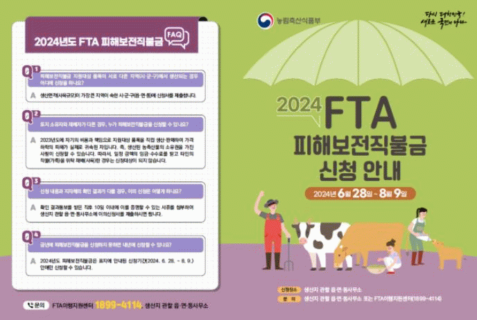 ‘피해보전직접직불제’란 자유무역협정 이행으로 수입량이 급격히 증가해 가격하락이 발생한 품목에 대해 그 피해 일부를 보전해 주는 제도로, 직불금 지급대상은 한·캐나다 FTA 협정 발효일(2015.1.1) 이전부터 한우·육우·한우 송아지 생산에 종사한 농업인 중 2023년도에 한우·육우·한우 송아지를 직접 생산·판매해 가격하락 피해를 입은 한우 사육 농가가 해당된다.