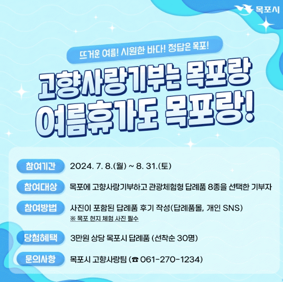 시 관계자는“여름 휴가철을 맞아 낭만항구 목포에 관심 가져주시고 방문해주시는 많은분들께 깊은 감사를 드리며, 이벤트 참여로 목포에서 특별한 추억 한 장과 고향사랑기부제 참여 혜택을 함께 누리시길 바란다”라고 말했다.