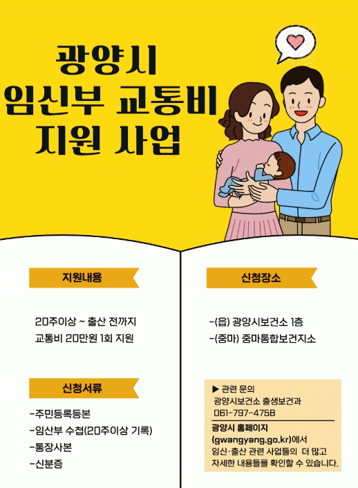 지원 관련 자세한 사항은 광양시보건소 출생지원팀으로 문의하면 된다.