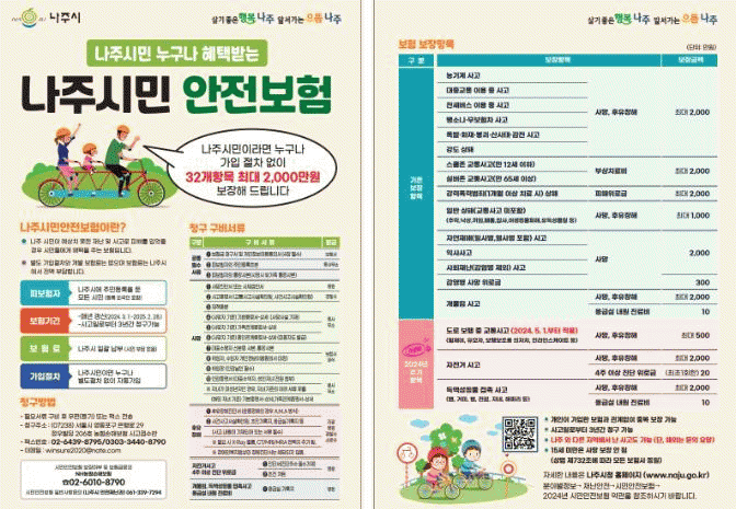 윤병태 나주시장은 “예기치 못하지만 일상에서 빈번히 발생하는 재난·사고에 대비해 시민안전보함 보장 범위를 매년 확대하고 있다”며 “적극적인 홍보와 더불어 재난 대비, 사고 예방을 위한 사회 안전망 구축에도 최선을 다하겠다”고 전했다.