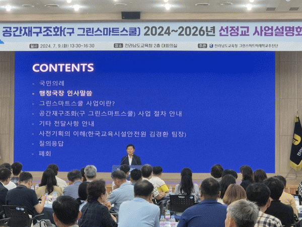 전라남도교육청은 7월 9일 청사 2층 대회의실에서 ‘공간재구조화 2024~2026년 선정교 사업 설명회’를 갖고 이런 내용의 공간재구조화사업(구 그린스마트스쿨) 추진 계획을 밝혔다.