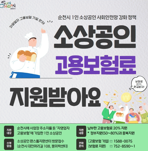 지원대상은 자영업자 고용보험에 가입한 순천시 소재 1인 소상공인으로, 소상공인이 먼저 근로복지공단에 고용보험 가입 후 순천시에 지원 신청하면 된다.