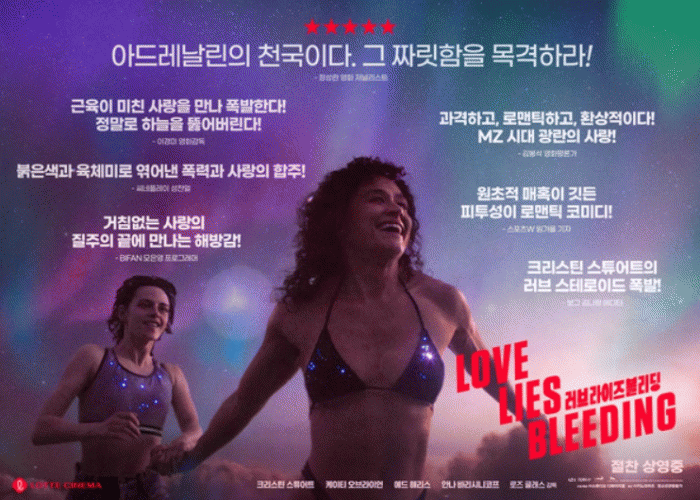 MZ 시대 광란의 사랑!” (김봉석 영화평론가), “원초적 매혹이 깃든 피투성이 로맨틱 코미디!” (스포츠W 임가을 기자), “크리스틴 스튜어트의 러브 스테로이드 폭발!” (보그 김나랑 에디터) 등 국내 언론 매체들의 찬사가 담겨 있어 기대를 더한다.