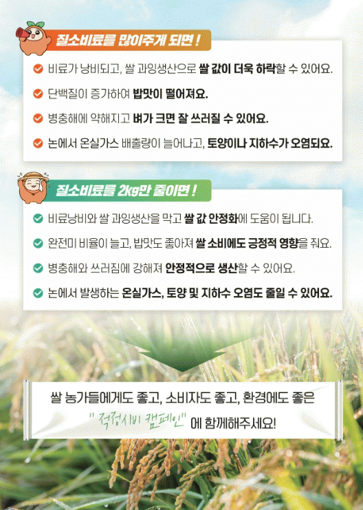 수량 감소를 우려하여 질소질 비료를 많이 주게 되면 단백질 함량이 높아짐에 따라 밥맛이 떨어져 쌀 소비가 감소하고, 쌀 과잉생산에 따른 쌀값 하락으로 농가소득 또한 감소한다.