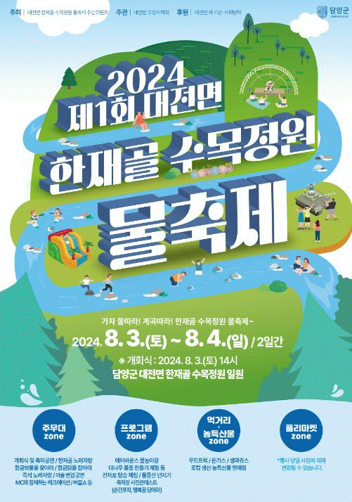 방남례 대전면 물축제추진위원장은 “다양한 볼거리, 먹거리, 체험이 준비되어 있는 물 축제에서 가족들과 함께 즐거운 추억을 남기길 바란다”라고 말했다.