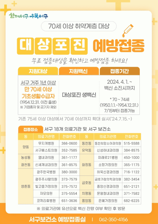 서구는 대상포진 발병 및 합병증을 최소화하고 노년기 건강한 삶 유지에 기여하기 위해 접종대상을 확대했다고 밝혔다. 이에 따라 관내 주민등록을 두고 실제 거주 1년이 넘은 70세 이상(1954년 12월 31일 이전 출생자) 기초생활수급자는 누구나 대상포진 생백신 1회 접종을 무료로 지원받을 수 있다.