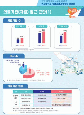 목포시에 따르면 전남 서부권은 동부권보다 전체 의료기관과 의사 수가 부족하고, 산업재해보상보험법에 따라 지정된 산재 전문 종합병원인 근로복지공단 순천병원(295병상)과 같은 전문병원도 동부권에만 운영 중이라고 밝혔다.