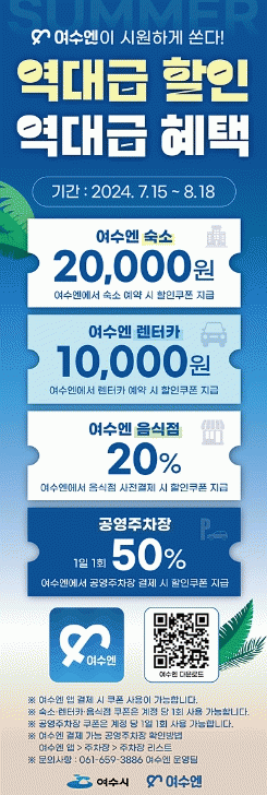 시 관계자는 “하계 휴가철을 맞아 우리 시를 찾는 많은 관광객을 위해 역대 최대 할인 혜택을 준비했다”며 “관광객뿐만 아니라 시민들에게도 제공되는 만큼 여수엔 이용자 수 증가와 소상공인 소득증대로 이어지기를 기대한다”고 밝혔다.