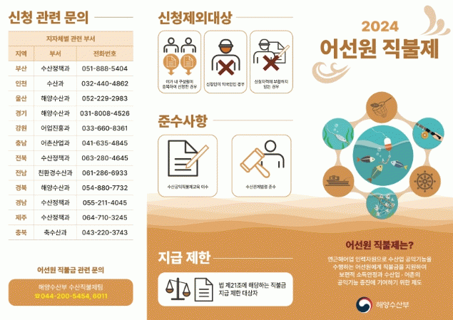 어선원 직불금은 연근해 어업허가를 받은 어선에 어선원으로 승선해 6개월 이상 근로를 제공한 어업인에게 지원되며, 지원액은 2023년보다 10만 원 증가한 130만 원을 지급한다.