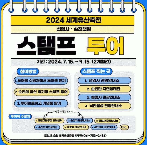 시 관계자는 “이번 스탬프 투어를 통해 순천이 보유한 세계유산만의 특별함과 더불어 지역의 매력을 만끽하시고, 오는 10월 한 달간 개최되는 2024 세계유산축전-선암사·순천갯벌에도 꼭 방문하길 바란다”고 말했다.