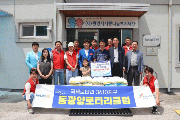 (재)광양시사랑나눔복지재단을 통해 진상면사무소에 전달된 백미는 회장 이, 취임식에서 축하 화환 대신 받은 쌀을 모은 것으로, 전달식에는 이병남 진상면장, 국제로터리 3610지구 동광양로터리클럽 이돈희 취임 회장, 동광양로터리클럽 회원들이 참석했다.