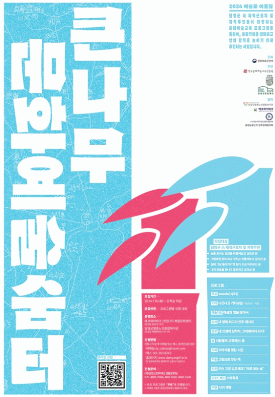 사업 선정에 따라 진행하는 프로그램 ‘큰나무문화예술숨터’는 담양 에코하이테크산업단지 내 복합문화센터와 담양군향촌노인종합복지관 등에서 무료로 진행되며, 이달 7월 16일부터 31일까지 선착순으로 모집한다.