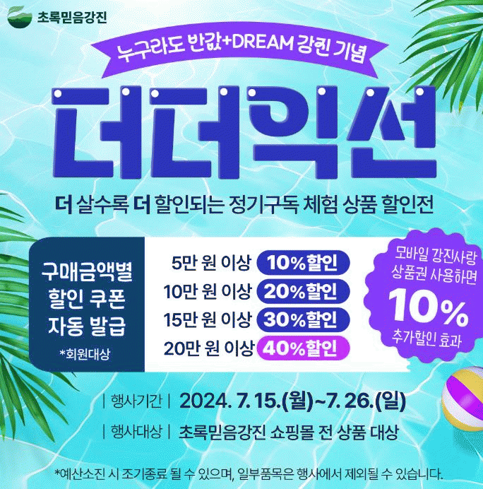 초록믿음강진 회원이라면 정기구독 체험용 쿠폰이 지급되며, 5만원 이상 구매 시 10%, 10만원 이상 구매 시 20%, 15만원 이상 구매 시 30%, 20만원 이상 구매 시 40% 할인이 적용된다.