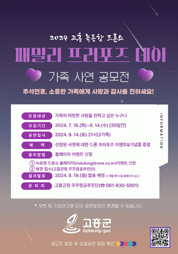 행사는 2가족을 선정해 오는 9월 14일 오후 9시, 사연에 대한 드론 프러포즈 이벤트 공연과 기념품을 제공할 예정이다. 자세한 내용은 고흥군 대표 누리집, 녹동항 드론쇼 홈페이지 및 인스타그램 등을 통해 확인할 수 있다.