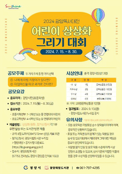 '어린이 상상화 그리기 대회'에 대한 자세한 사항은 광양시립도서관 누리집(홈페이지)에 접속해 확인하거나, 광양희망도서관으로 문의하면 된다.