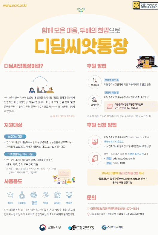디딤씨앗통장은 취약계층 아동이 사회에 진출할 때 필요한 초기비용 마련을 위하여 정부에서 운영하는 아동 자산형성 지원 사업이며, 아동 적립금 월 5만 원 내의 범위에서 1:2로 매칭하여 국가가 월 최대 10만 원까지 지원하게 된다.