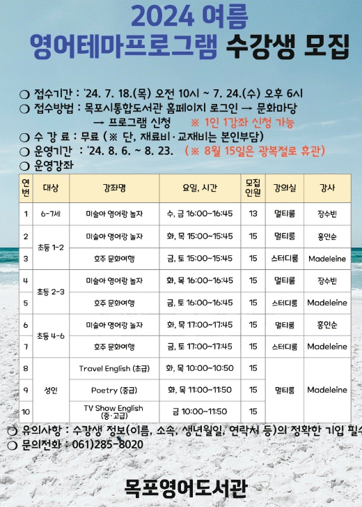 수강을 원할 경우 오는 18일부터 24일까지 목포시통합도서관 누리집에서 선착순 신청받으며, 기타 자세한 내용은 통합도서관 누리집(열린마당→공지사항)을 참고하면 된다.