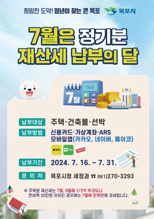 시 관계자는 “재산세는 시민들의 복지 증진과 지역발전을 위한 소중한 자주재원으로 납부를 당부드린다”고 전했다.