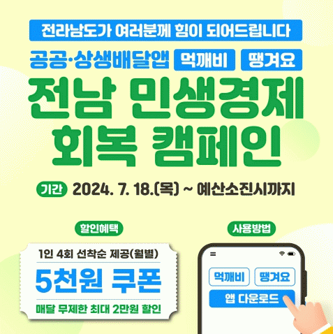 이번 할인캠페인은 전라남도에서 운영하고 있는 배달앱인 공공배달앱 ‘먹깨비’와 상생배달앱 ‘땡겨요’에서 매월 1인 4회, 5천원 할인쿠폰을 지급하여 소비자는 최대 2만원의 할인 혜택을 누릴 수 있다.