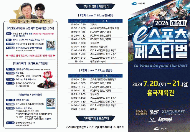 이 밖에 ▲가족이 함께 즐기는 추억의 오락실과 콘솔게임 ▲e런 캠핑 ▲코스프레 포토타임 ▲게임 캐릭터 페이스페인팅·헤어·뷰티 체험 ▲즉석사진 ▲2024 전남 e스포츠대회 홍보관 운영 등 다양한 부대행사도 마련될 예정이다.
