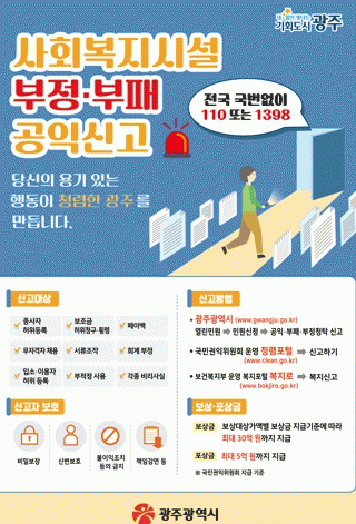 광주시는 이를 위해 5개 자치구와 함께 지역 사회복지시설 2223개소에 공익신고 홍보포스터 4000부를 이달 중 제작·배포할 계획이다.