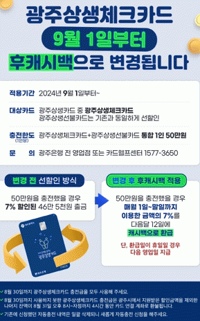 광주광역시(시장 강기정)는 광주상생체크카드의 할인지원방식이 충전금액의 7%를 할인해 주는 선 할인에서 충전금액을 사용한 후 7%를 환급(캐시백)해주는 방식으로 변경된다고 밝혔다.