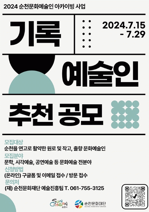 순천문화재단 관계자는 “이번 기록예술인 추천 공모를 통해 순천이 기록해야 할 문화예술인이 적극 발굴되고 재조명되는 소중한 기회가 되기를 바란다”며, “예술인들의 많은 관심과 참여를 바란다”고 말했다.