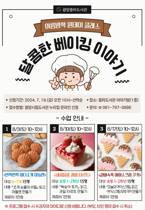 '달콤한 베이킹 이야기'는 오는 8월 3일부터 8월 17일까지 매주 토요일 3회에 걸쳐 진행될 예정이며 유아(6세,7세), 어린이(초등 1학년, 2학년)가 모집 대상이다.