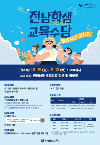 이번 공모전은 전남학생교육수당을 받고 있는 초등학생 및 학부모들을 대상으로 하며, 실제 경험한 활용사례를 그림(그림일기, 포스터, 네컷만화 등)과 글(체험 수기)로 표현해 제출하면 된다.
