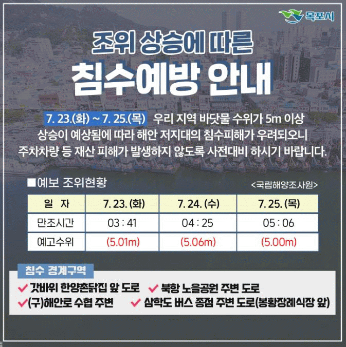 한편, 목포시는 바닷물 수위가 조석표상 조고 4.90m이상일 경우 해수 위험일로 지정해 시민들의 재산피해가 발생하지 않도록 침수피해 예방에 적극 대처하고 있다.