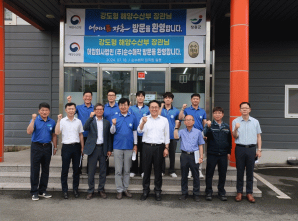 이날 강도형 장관은 김성 장흥군수, 박영채 전남도 해양수산국장과 함께 장흥군 바이오산업단지 내 위치한 ㈜순수해작에서 공장 현황 설명과 가공·유통 시스템 등 전반 사항을 점검하고, 김 수출 증대를 위해 더욱 노력해 줄 것을 주문했다.