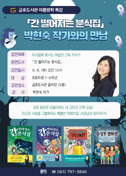 그 중'박현숙 작가와의 만남'은 초등학생들 사이에서 인기 있는 공포소설인 ‘간 떨어지는 분식집’의 저자를 초청해 강연을 진행할 예정이다.