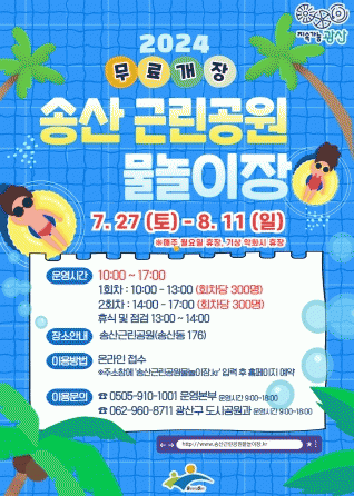 박병규 광산구청장은 “올해 처음 여는 송산근린공원 어린이 물놀이장이 시민에게 시원한 여름을 선물하는 최고의 도심 피서지가 되길 바란다”며 “가장 신나고, 안전한 물놀이 공간이 되도록 수질?안전 관리에도 만전을 기하겠다”고 밝혔다.
