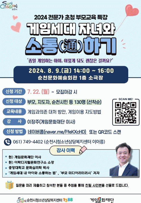 특강은 부모 및 지도자 등 순천시민이면 누구나 무료로 참여할 수 있으며, 네이버폼 또는 QR코드 스캔을 통해 신청이 가능하다.