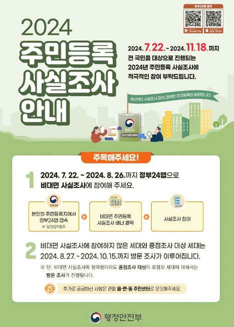 주민등록 사실조사는 주민등록지와 실거주지 일치 여부를 조사하는 것으로 정부 24앱을 통해 8월 26일까지 비대면-디지털 조사를 진행한 후 10월 15일까지 세대에 직접 방문하여 확인하는 방문 조사를 실시한다.