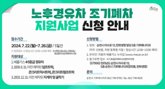 신청을 희망하는 차량 소유자는 7월 22일부터 7월 26일까지 방문, 인터넷(자동차 배출가스 누리집, 등기우편 등으로 신청 가능하며, 기타 지원조건 및 자세한 사항은 순천시 누리집 고시/공고 게시판에서 공고문을 확인하면 된다.