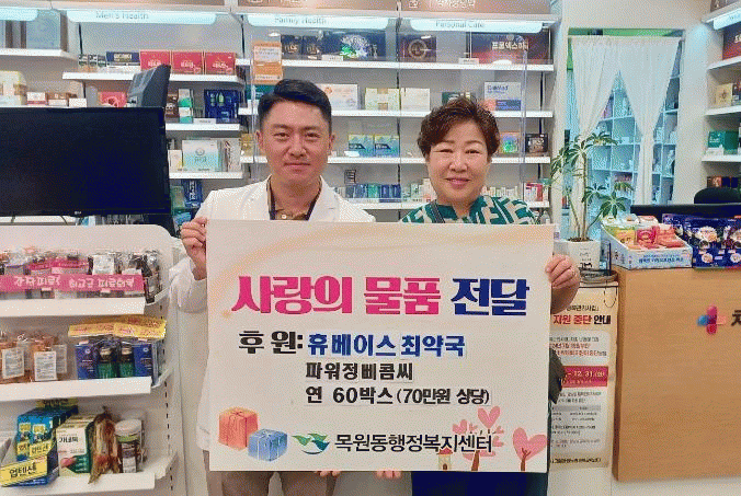박현주 목원동장은 “어려운 이웃을 위해 도움을 주신 휴베이스 최약국에 감사드린다”며 “도움이 필요한 곳에 감사한 마음과 함께 소중하게 전달하겠다”고 밝혔다.