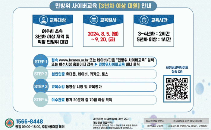 교육 방법은 여수시청 홈페이지에 있는 배너를 클릭하거나 민방위사이버교육 홈페이지에 접속하여 본인인증 후 수강하면 된다. 3~4년 차 대원은 2시간, 5년 차 이상 대원은 1시간의 교육을 수강하고 객관식 평가에서 70점 이상을 받으면 이수 된다.