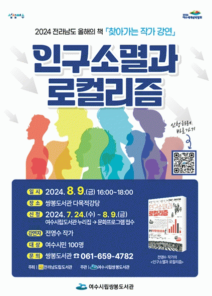 전경수 작가는 ‘2024 전라남도 올해의 책’ 비문학 부문에 선정된 『인구소멸과 로컬리즘』의 저자로, 대한민국의 저출산 및 도·농간의 인구 불균형으로 지방도시 소멸 위기 극복을 위한 다양한 전략과 아이디어를 전달할 예정이다.