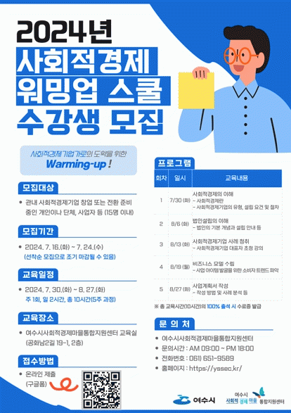 시 관계자는 “워밍업 스쿨은 사회적 가치와 경제활동을 동시에 추구하는 사회적경제기업이 잘 정착하도록 돕는 자리”라며 “관심 있는 분은 꼭 참여해 주길 바란다”고 전했다.