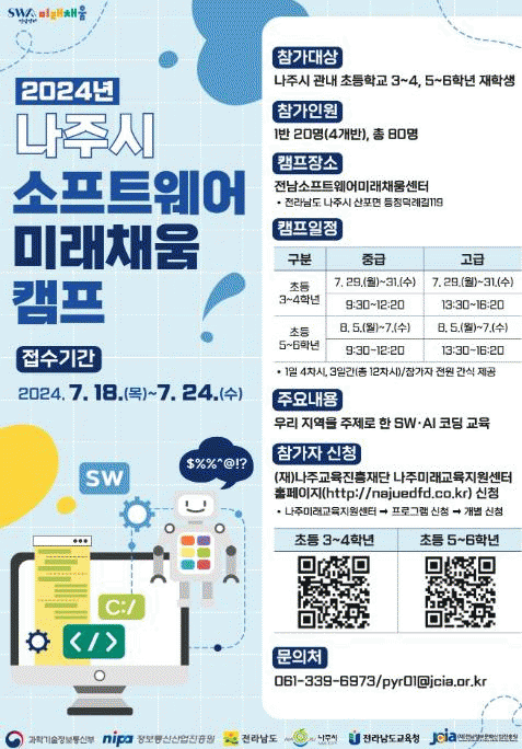 관내 초등학교 3학년부터 6학년 각 20명씩 4개반을 구성할 예정이며 전남 소프트웨어(SW) 미래채움센터(나주시 산포면 등정덕례길 119)에서 7월 29일부터 8월 7일까지 총 8회차로 진행한다.