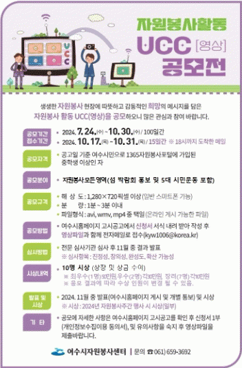 이번 공모 대상은 1365자원봉사포털에 가입된 중학생 이상 여수시민으로, 2026여수세계섬박람회 홍보와 5대 시민운동을 포함한 자원봉사 모든 영역을 주제로 촬영하여 3분 이내 영상으로 제출하면 된다.